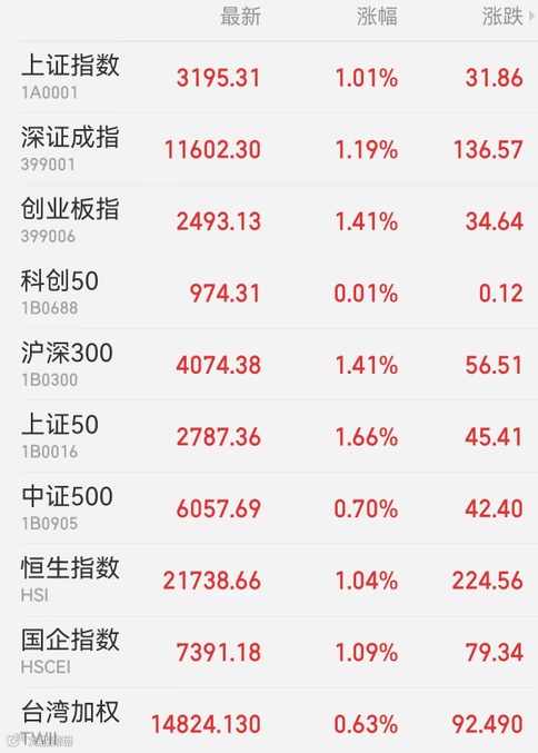1、A股:A股单边上行,上证指数逼近3200点创1个月新高,创业板指逼近2500点创4个月新高。大金融、大消费发力,新能源、半导体赛道则出现大面积回调。截至收盘,上证指数收涨1.01%报3195.31点,深证成指涨1.19%,创业板指涨1.41%,科创50指数涨0.01%,万得全A涨0.89%,万得双创涨0.58%;市场成交额7025.9亿元。上周沪指累涨1.19%,录得周线三连阳;创业板指累涨近3%。北向资金单日净买入133.36亿元,开年累计净买入达640亿元;宁德时代、贵州茅台、中国平安分别获净买入10.74亿元、8.82亿元、7.04亿元。