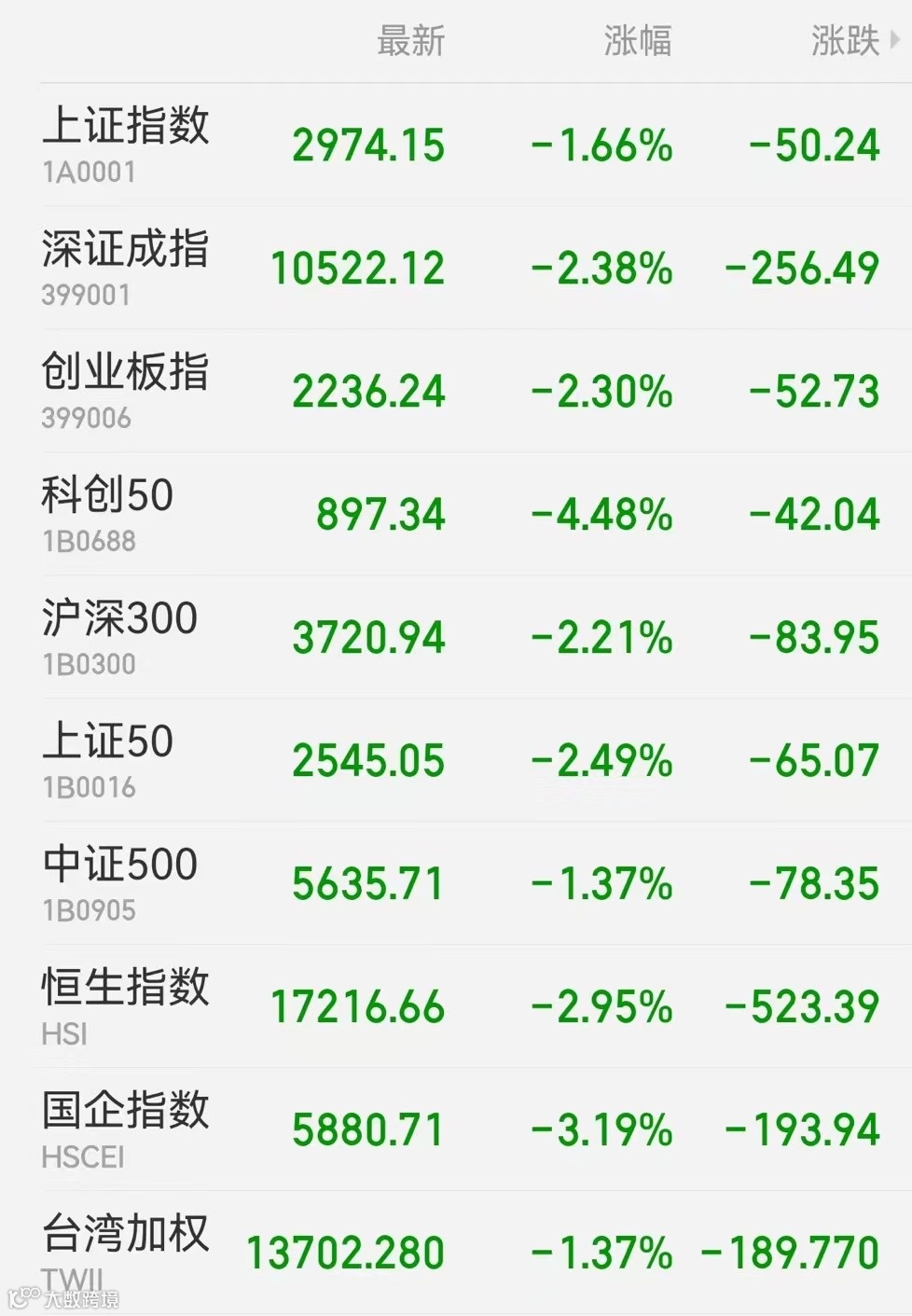 2、港股:港股低开低走全天弱势震荡,恒生指数收跌2.95%报17216.66点,恒生科技指数跌3.98%,盘中续创新低;恒生国企指数跌3.19%。大市成交951.05亿港元。科技、消费、半导体、有色股跌幅居前,比亚迪电子跌近11%,李宁跌近9%,美团跌近7%。芯片半导体股下挫,上海复旦跌超20%,华虹半导体跌超9%。