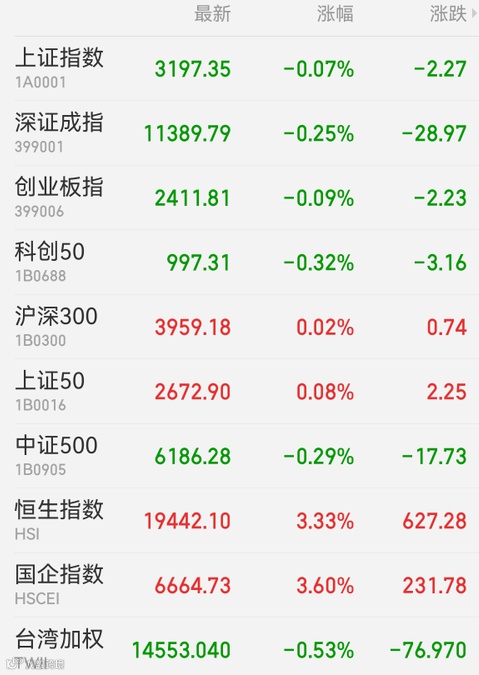 2、港股:港股全天强势上涨,恒生指数收盘涨3.38%报19450.23点,恒生科技指数涨6.64%,恒生国企指数涨3.63%。大市成交1606.94亿港元,南向资金净卖出4.24亿港元。互联网医疗股再度爆发,科技、医药、大消费、博彩股涨幅居前。中国台湾加权指数收盘跌0.53%。
