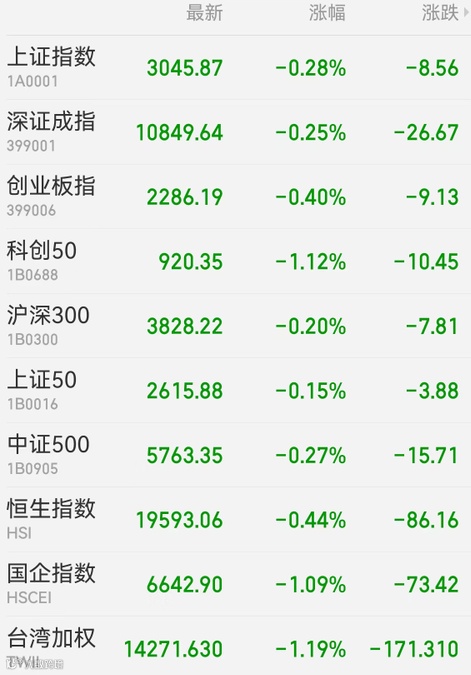 1、A股:上证指数收跌0.28%报3045.87点,深证成指跌0.25%,创业板指跌0.40%,万得全A、万得双创分别跌0.31%、0.42%。北向资金因假期暂停交易,市场全日成交5859.10亿元,仍维持地量状态。A股三大指数连挫5日,上周均跌近4%,科创50跌近6%。