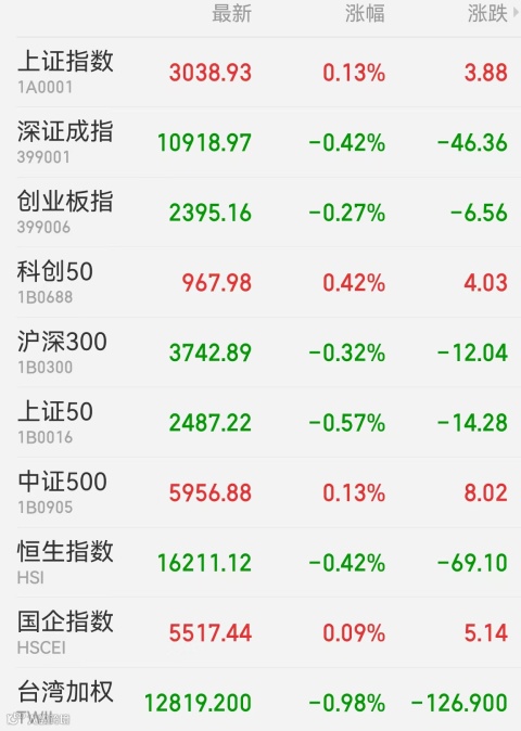 1、A股:沪深两市全天缩量震荡,题材股短线分歧进一步加大。截至收盘,上证指数涨0.13%报3038.93点,深证成指跌0.42%,创业板指跌0.27%,万得全A、万得双创涨跌不一。两市全天成交7134亿元,环比缩量超600亿。盘面上,外资对机构重仓股的压制远未停止,多只消费权重再度跟随上证50创下阶段新低。电力、教育信息化、储能、Chiplet表现抢眼,而白酒等大权重则继续拖累指数上行。