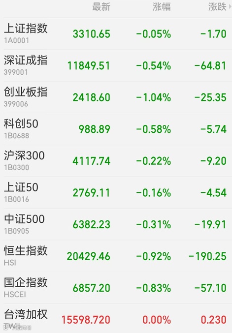 2、港股:香港恒生指数收跌0.92%报20429.46点,恒生科技指数跌1.42%,恒生国企指数跌0.83%,大市成交1105.08亿港元,南向资金净买入73.11亿港元。个股方面,蔚来跌逾13%,股价创港股上市以来新低;微博跌逾11%;小鹏汽车跌逾5%。中国台湾加权指数收涨0.23点,报15598.72点。