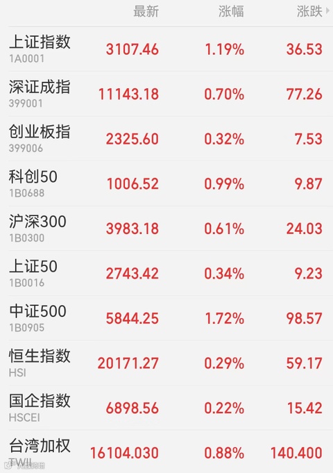 1、A股:全国稳住经济大盘电视电话会议提振多方信心,A股三大股指震荡收高,上证指数涨1.19%报3107.46点,创业板指涨0.32%报2325.6点,深证成指涨0.7%报11143.18点;大市成交0.76万亿元。盘面上,油气开采、养殖、零售、航空运输、纯碱、电力、港口、海运、文化传媒板块全天强势,特高压、充电桩、汽车、建筑板块午后拉升,煤炭板块热度不减。动力电池、白酒、石化板块疲软。