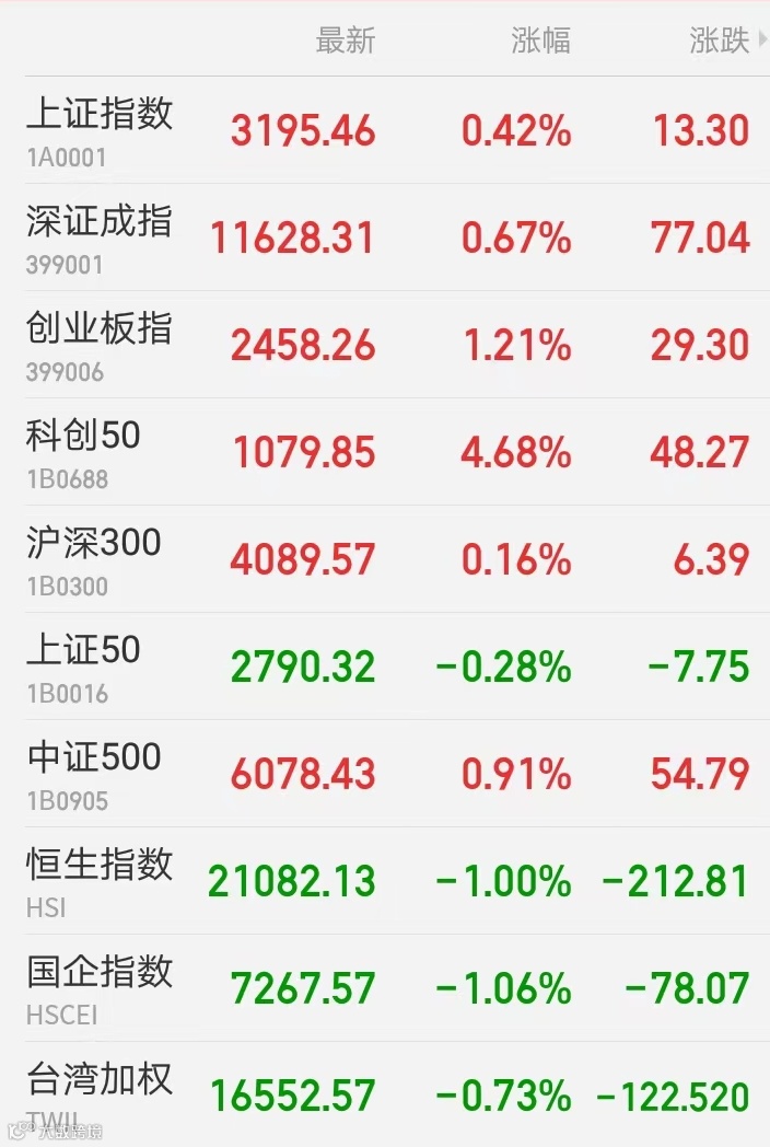 1、A股:沪深三大股指全天震荡走升,上证指数收盘涨0.42%报3195.46点,创业板指涨1.21%报2458.26点,深证成指涨0.67%报11628.31点;科创50涨4.68%报1079.85点,步入技术性牛市。盘面上,汽车板块强者恒强,汽车零部件股随风而动;稀土、动力电池、半导体、工业机械、钢铁、通讯设备、光伏、风电、军工板块纷纷走强。油气、煤炭、地产、白酒、旅游出行板块调整。机构指出,目前市场机会远大于风险,紧盯稳增长、促销费、新能源三条主线。