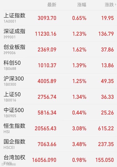 1、A股:沪深三大股指全天震荡攀升,上证指数收盘涨0.65%报3093.7点,创业板指涨1.62%报2369.09点,深证成指涨1.23%报11230.16点;大市成交0.79万亿元。盘面上,汽车板块火力十足,长城汽车、中国重汽等涨停,比亚迪涨近6%。锂矿、半导体板块造好,赣锋锂业一度涨停,韦尔股份封板。光伏板块午后持续拉升,中利集团、亚玛顿、拓日新能同步涨停,隆基绿能、通威股份、晶澳科技、天合光能并驾齐驱。稀土、煤炭、金融、油气、化肥板块普遍活跃,盘江股份2连板,招商银行放量反弹。抗疫、建筑、生物育种板块调整,众生药业、浙江建投等跌停。地产股走势分化,中交地产、中洲控股跌停。