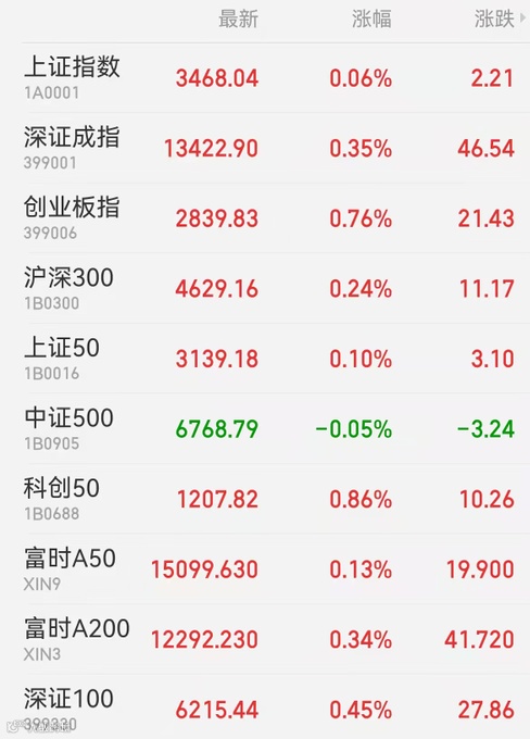 1、A股:A股震荡上行,上证指数收盘涨0.06%报3468.04点,录得三连阳;深证成指涨0.35%报13422.9点,创业板指涨0.76%报2839.83点;沪深两市成交额超9000亿元。盘面上,锂电、新能源等赛道股反弹,环保、园林工程集中爆发,避险情绪推动黄金股午后上攻,军工股短暂异动。旅游、影视、民爆概念走弱。