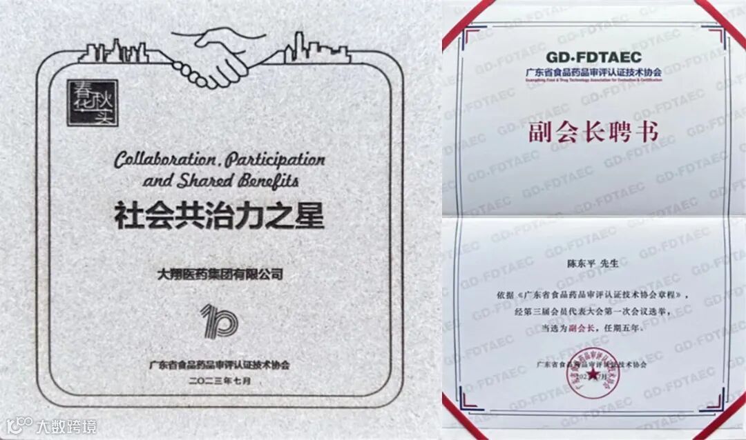 由广东省食品药品审评认证技术协会常务副会长兼秘书长杨田亲自到大翔集团来向集团董事长陈东平先生颁发“任广东省食品药品审评认证技术协会副会长”聘书,向大翔医药集团有限公司颁发了协会成立十年庆典评为“社会共治力之星”荣誉奖牌。
