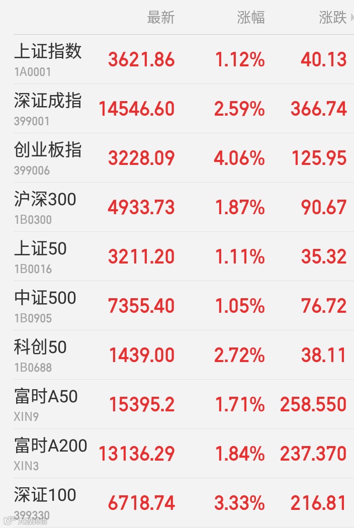1、A股:沪深两市股指全天强势走升,市场演绎高低切换,前期相对低迷的医药、大消费强力反弹,券商、煤炭板块活跃,盐湖提锂、稀土板块探底回升;光伏、磷化工、纯碱板块全天低迷。上证指数收盘涨1.12%报3621.86点,深证成指涨2.59%报14546.6点,创业板指涨4.06%报3228.09点;两市成交额连续第34个交易日突破1万亿元。新三板概念、券商、创投概念再度活跃,新三板精选层全线飘红,61只个股涨幅超10%,同辉信息等近10只个股涨停。