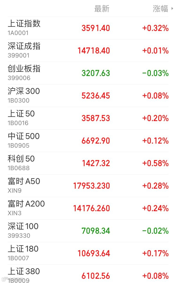 1、A股:周三,上证指数报3591.60点,上涨0.32%,成交额4032.36亿。深证成指报14718.40点,上涨0.01%,成交额4777.96亿。创业板指报3207.63点,下跌0.03%,成交额1744.34亿。两市合计成交8810.33亿。盘面上,鸿蒙概念、钛白粉、煤炭板块领涨,啤酒概念、医药电商、代糖概念跌幅前列。