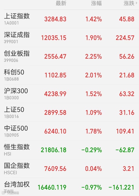 截至收盘,上证指数收涨1.42%报3284.83点,创业板指涨2.25%报2556.47点,深证成指涨1.90%报12035.15点;大市成交1.05万亿元。盘面上,新能源汽车产业链领涨大市,稀土、铝、光伏、券商、化工、电力、白酒、油气、煤炭板块纷纷造好;生物育种、猪肉、地产板块休整。