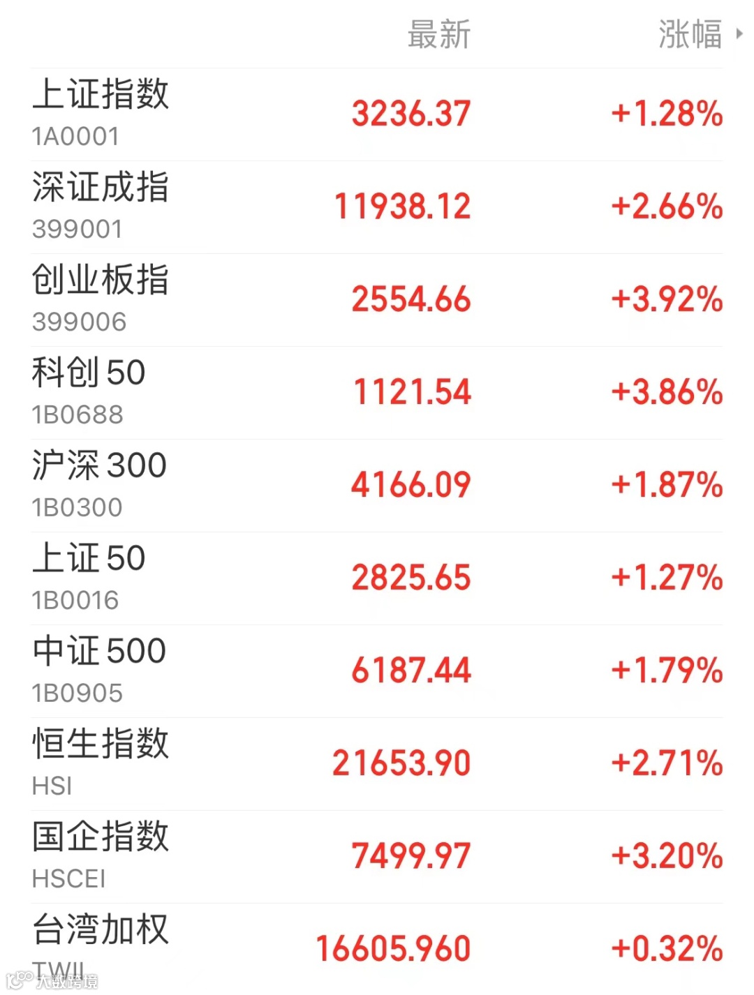 1、A股:沪深股指全线上扬,上证指数重回3200点,“锂、光、芯”等热门赛道纷纷崛起,宁德时代再涨近7%,创业板指进入技术性牛市;沪深两市成交额重回万亿大关,达到1.11万亿元。截至收盘,上证指数涨1.28%报3236.37点,创业板指涨3.92%报2554.66点,深证成指涨2.66%报11938.12点。盘面上,锂矿指数大涨近9%,盐湖提锂、动力电池指数均涨6%左右,光伏、汽车、煤炭、券商及CRO板块造好;地产股表现低迷。北向资金跑步进场,大幅净买入112.55亿元,贵州茅台、紫金矿业均获净买入逾6亿元。