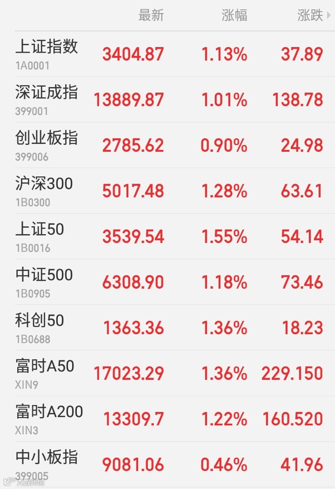 1、A股:A股强力上攻,上证指数重返3400点。截至收盘,上证指数上涨1.13%报3405.01点,深证成指涨1.01%,创业板指涨0.9%。两市成交额接近8000亿元。北向资金净买入80.58亿元,创逾2周来最大金额净买入。