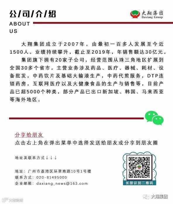 广东大翔集团自成立以来就积极推进企业内部党组织建设与发展,2008年成立党支部,2019年经上级党工委批准成立中共广东大翔医药集团有限公司党总支。多年来,全集团始终坚持“把优秀的员工干部培养成为党员、把党员培养为干部”的理念,努力使党的建设与企业的发展紧密结合、相互促进。集团在党组织的带领和党员的先锋模范带头作用引导下,树牢“四个意识”、坚定“四个自信”、 坚决做到“两个维护”,凡事勇于担当作为,上下一心以求真务实作风经营企业和扎实工作。