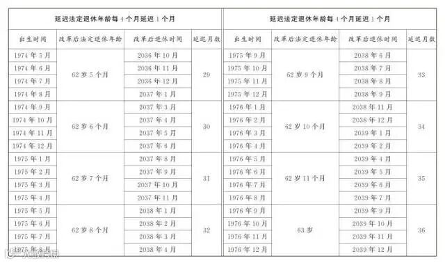 “临近退休的人,只会延迟1个月或几个月,不会一下子晚退休好几年。”莫荣举例说,以男职工为例,1965年1月至4月出生的,法定退休年龄提高1个月,即60周岁零1个月;1965年5月至8月出生的,法定退休年龄提高2个月,即60周岁零2个月;以此类推,1976年9月至12月出生的,法定退休年龄均为63岁,对1976年12月以后出生的,表格上就不再列举。”