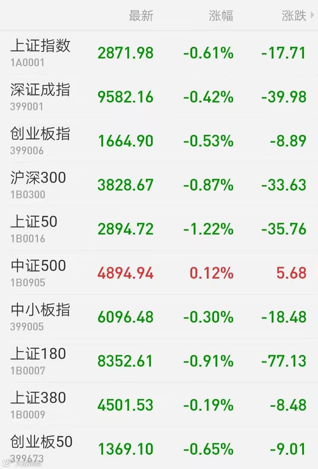 1、A股:上证指数收盘跌0.61%报2871.98点,连跌三日,周跌0.46%;深证成指跌0.42%,周跌0.46%;创业板指跌0.53%,周跌0.89%。两市成交3416亿元,较上日略有放大。北向资金净流入6.7亿元,连续12日净流入,11月累计流入超600亿元。京东方A、迈瑞医疗、伊利股份当日分别获净买入2.95亿元、1.94亿元、0.83亿元。11月上证指数跌近2%,深证成指跌0.55%,创业板指跌0.38%。