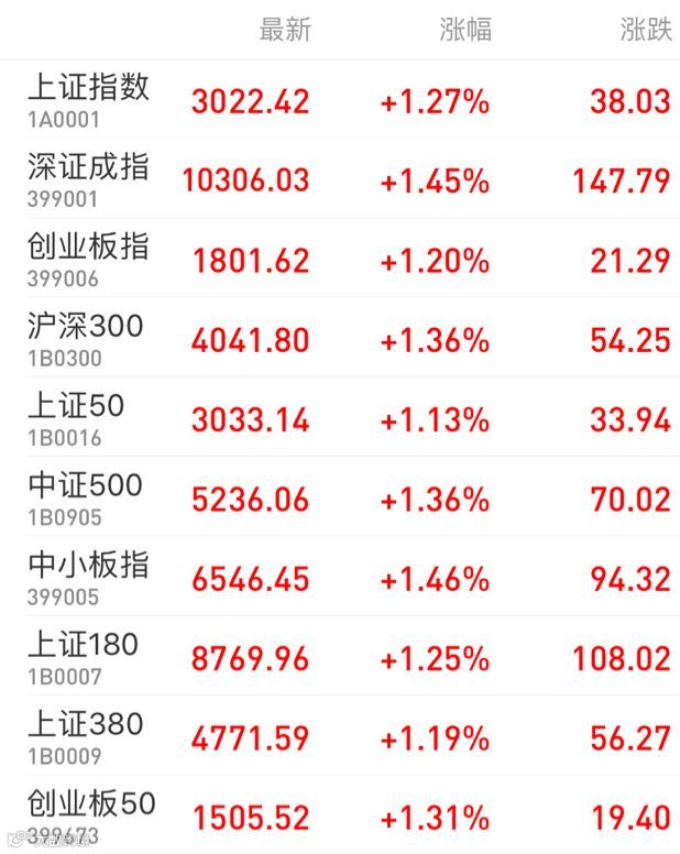 1、A股:强势上攻,上证指数收盘涨1.27%,收复3000点并创三个月新高;深证成指涨1.45%续创8个月新高;创业板指站上1800点,创出一年半新高。券商、银行、保险强势走高,邮储银行、中国人保触及涨停。两市成交逾7500亿元,量能再度刷新三个月以来最高。北向资金净流入88.06亿元,连续24日净流入,累计净流入911亿元。