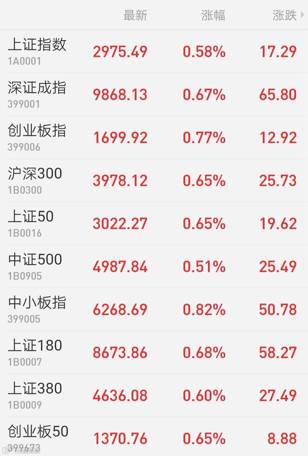 1、A股:上证指数收盘报2975.49点,涨0.58%;深证成指报9868.13点,涨0.67%;创业板指报1699.92点,涨0.77%。万得全A涨0.6%。两市成交4694.13亿元,较上日放量近350亿元。阿尔茨海默病国产创新药获批,京新药业等涨停。