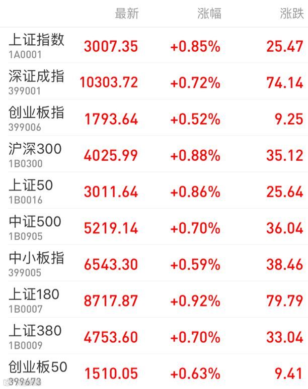 1、A股:上证指数收涨0.85%报3007.35点,深证成指涨0.72%报10303.72点,创业板指涨0.52%报1793.64点,两市成交5036亿元。市场在外资暂停交易的三日内表现出色。大金融板块尾盘发力,券商、多元金融涨势强劲;地产产业链表现强势。个股方面,酒鬼酒大涨近7%。