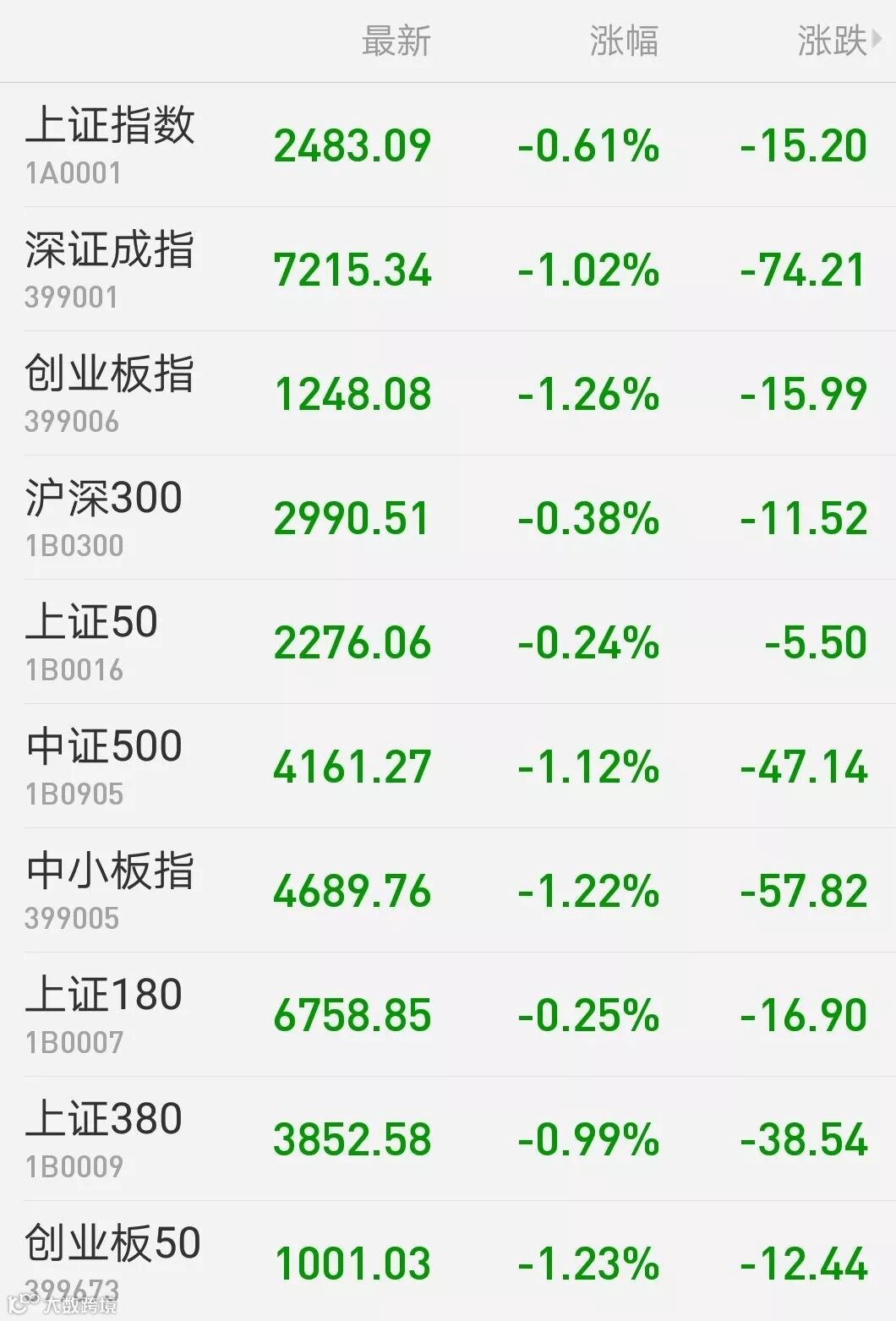 1、A股:沪深两市大幅高开后单边下行,上证综指收跌0.61%报2483.09点,连跌三日;深证成指跌1.02%报7215.34点,创业板指跌1.26%报1248.08点,万得全A收跌0.91%。两市全天成交2638亿元,北上资金逆势净流入逾5亿元。板块方面,5G板块分化进一步加剧,头部个股继续大涨,但其余科技股表现糟糕;创投股全线杀跌,石油板块全线回落。个股方面,中国石化午后闪崩,放量收跌6.75%,创年内第二大跌幅,早盘一度涨近4%;中国平安遭遇尴尬10连跌;中弘退走完最后一个交易日,收涨近5%,尾盘触及涨停。
