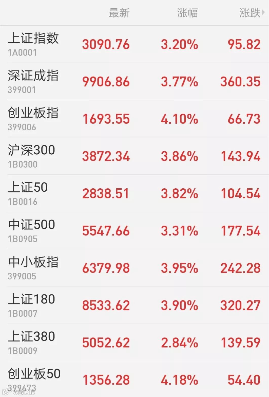 1、A股:上证综指收盘涨3.2%报3090.76点,创一个月来最大日涨幅,周跌0.43%,月涨5%;深证成指涨3.77%报9906.86点,周涨0.28%,月涨约10%;创业板指涨4.1%报1693.55点,周跌0.02%,月涨约10%;万得全A涨3.4%。两市成交8363亿元,较上日放大两成。北向资金周五大幅净流入110.93亿元,刷新2018年12月3日以来新高。