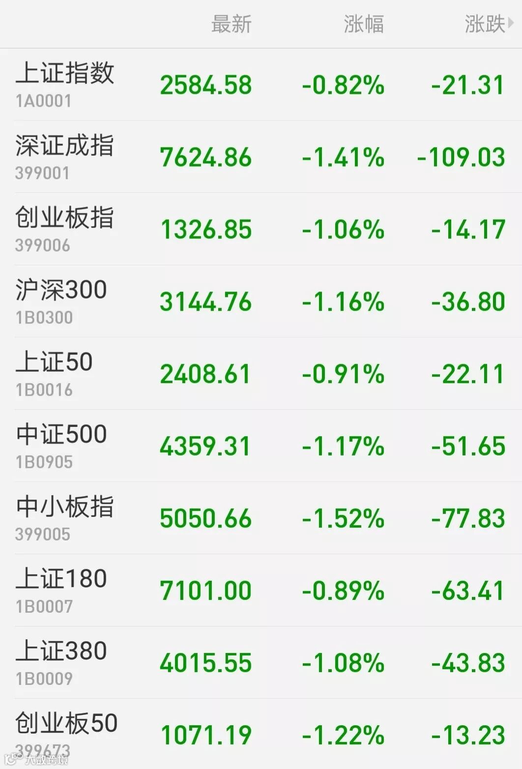 1、A股:沪深两市全天低迷,上证综指收跌0.82%报2584.58点,深证成指跌1.41%报7624.86点,创业板指跌1.06%报1326.85点,连跌三日;万得全A收跌逾1%。两市成交仅2400亿元。板块方面,5G、黄金板块逆势造好,充电桩概念盘中拉升;医药股仍深陷泥潭,乐普医疗连续3日跌停;家电板块全线走低,电气、军工、民航、海运等上周略有表现板块纷纷回撤。个股方面,ST慧球连续7日涨停;永泰能源复牌跌停,公司债务重组取得实质进展。