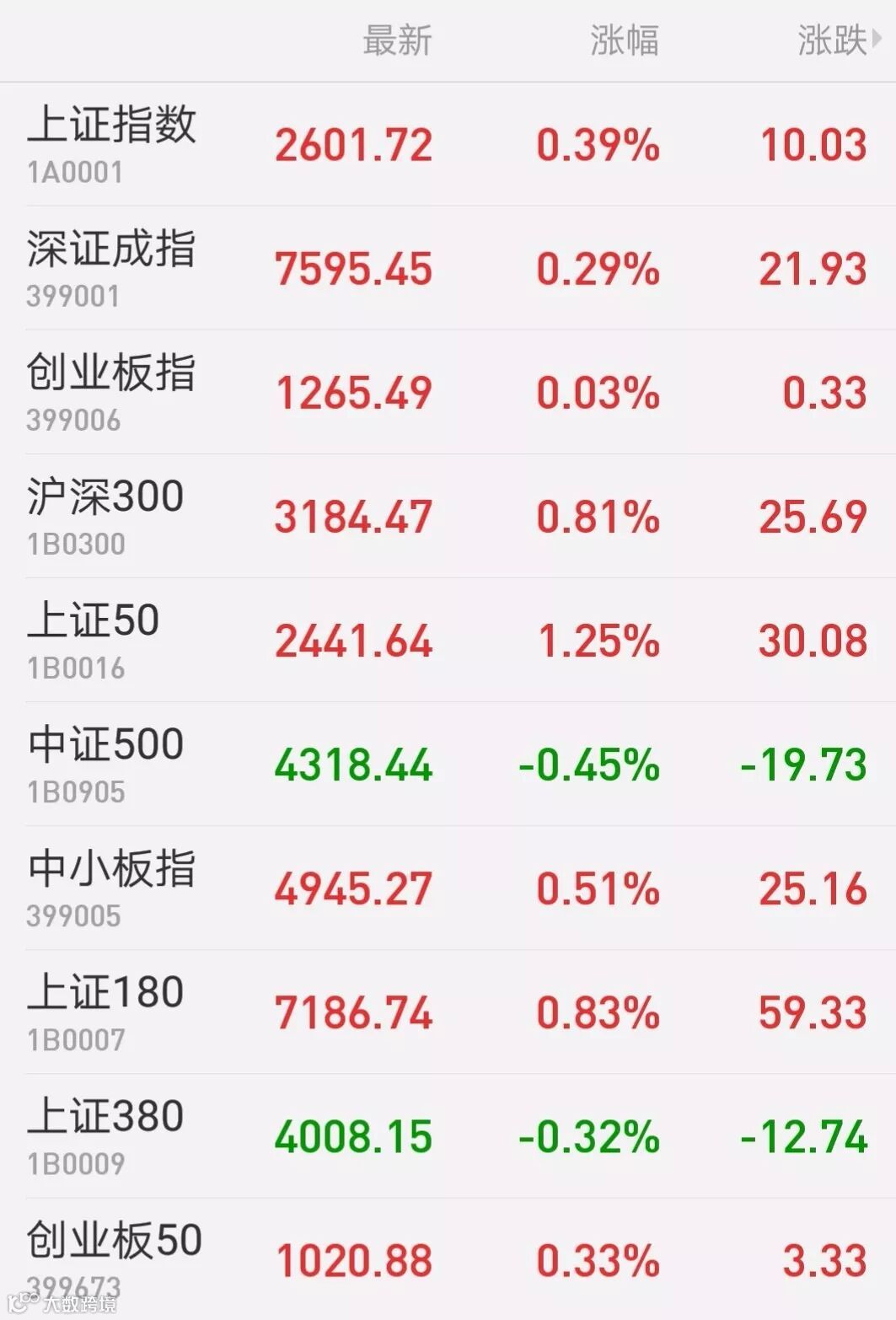 1、A股:上证综指收涨0.39%报2601.72点,深证成指涨0.29%报7595.45点,创业板指涨0.03%报1265.49点,上证50收涨1.25%,万得全A涨0.13%。两市成交3129亿元,较前日3000亿元略有放大。上证综指及深成指双双连涨4周;创业板指上周表现相对较弱,周跌0.32%。