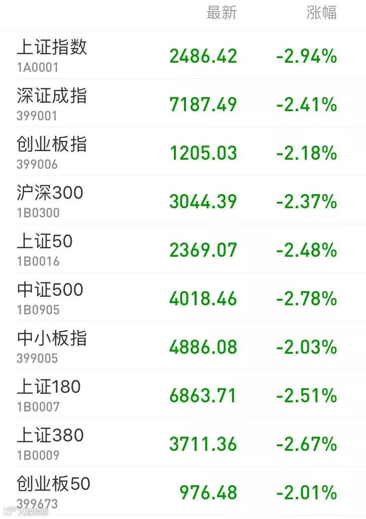 1、A股:上证指数报2486.42点,下跌2.94%,个股一片惨绿,逾百只个股跌停,中国石油、中国交建、中国铁建等一批中字头权重股砸盘,市场强势板块相继补跌,成交额1065.77亿。深证成指报7187.49点,下跌2.41%,成交额1330.97亿。两市合计成交2396.74亿。从盘面看,海南、油改、黄金、煤炭、高送转、天然气等板块领跌。
