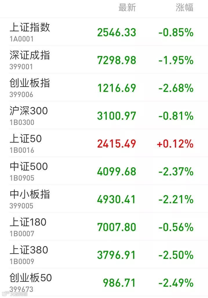 1、A股:三大股指盘中均创阶段新低,上证综指收跌0.85%报2546.33点,深证成指跌1.95%失守7300点,创业板指跌2.68%报1216.69点,上证50逆势飘红,万得全A收跌1.45%。两市仅成交2360亿元,量能持续地量状态。