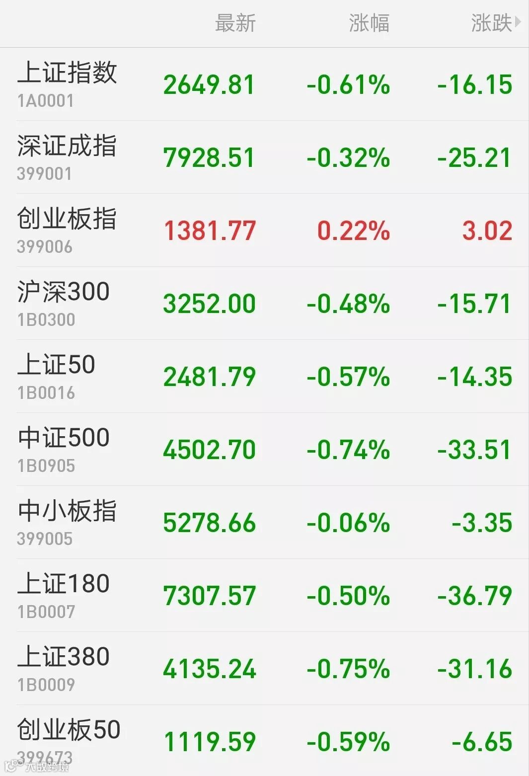 1、A股:上证综指结束三连涨,收跌0.61%报2649.81点,险守60日线;深证成指跌0.32%报7928.51点,创业板指逆势涨0.22%报1381.77点,万得全A收跌0.57%。两市成交逾3200亿元。北上资金连续8日净流入。板块方面,创投股全线重挫,市北高新等多股跌停;恒立实业等壳资源股也遭滑铁卢;知识产权板块全天强势,光伏、养猪板块表现不俗。ST概念尾盘突击上攻,ST慧球否认新浪有借壳回A计划但仍连续4日涨停。