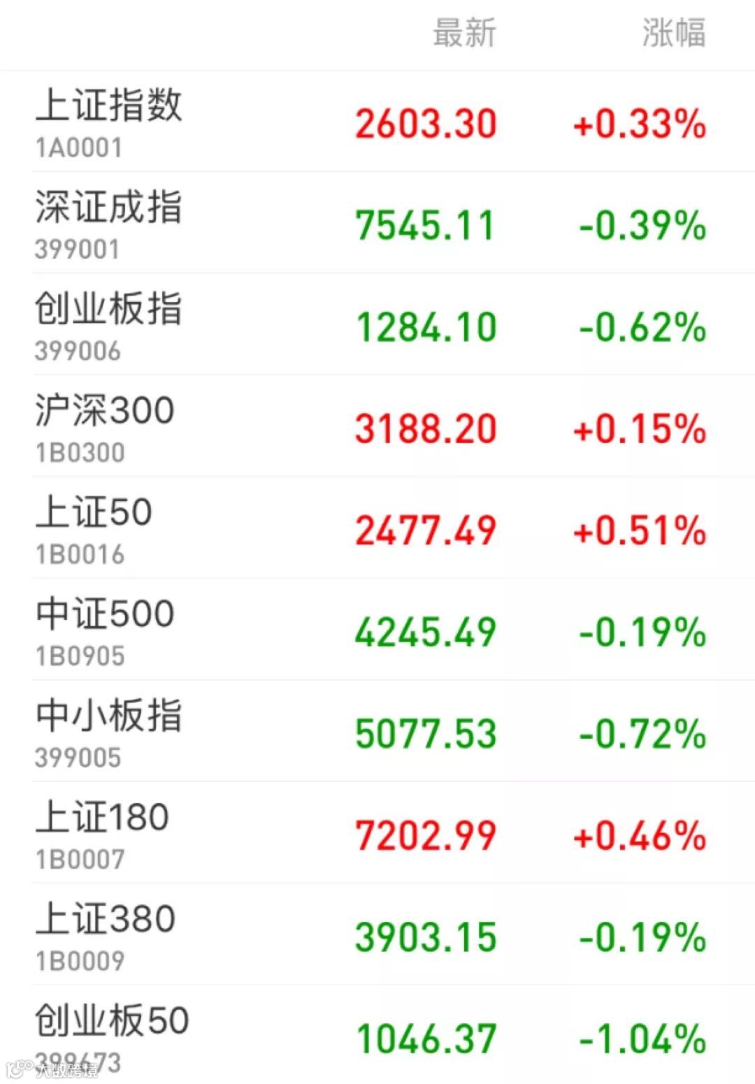1、A股:上证综指收涨0.33%报2603.3点,盘中一度涨1.76%;深证成指跌0.39%报7545.11点,创业板指跌0.62%报1284.1点,万得全A收涨0.08%。两市成交不足3000亿元,上日成交超过3500亿元。
