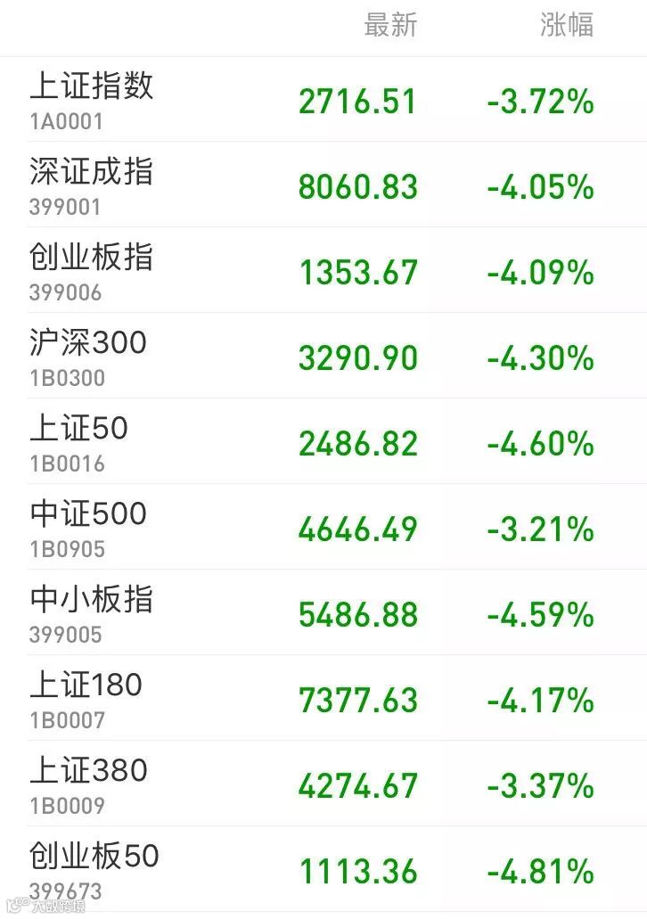 1、A股:上证指数报2716.51点,下跌3.72%,成交额1415.32亿,创下近四个月最大单日跌幅。深证成指报8060.83点,下跌4.05%,成交额1474.15亿。创业板指报1353.67点,下跌4.09%,成交额400.64亿。两市合计成交2889.46亿。从盘面看,安防设备、通讯行业等板块领跌。