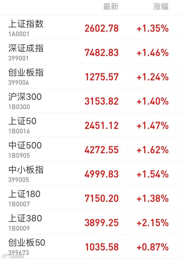 1、A股:A股10月收官战,三大股指均涨1%。上证综指收涨1.35%报2602.78点,深证成指涨1.46%报7482.83点,创业板指涨1.24%报1275.57点,万得全A收涨近1.5%。两市全天成交逾3100亿元。北上资金大幅流入逾60亿元,创5个月新高,并为连续三日净流入。