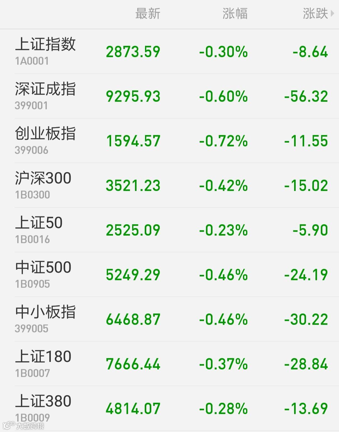 1、A股:上证指数报2873.59点,下跌0.3%,成交额1324.19亿。深证成指报9295.93点,下跌0.6%,成交额1782.53亿。创业板指报1594.57点,下跌0.72%,成交额592.63亿。两市合计成交3106.72亿。从盘面看,钢铁行业、酿酒行业等板块涨幅居前。