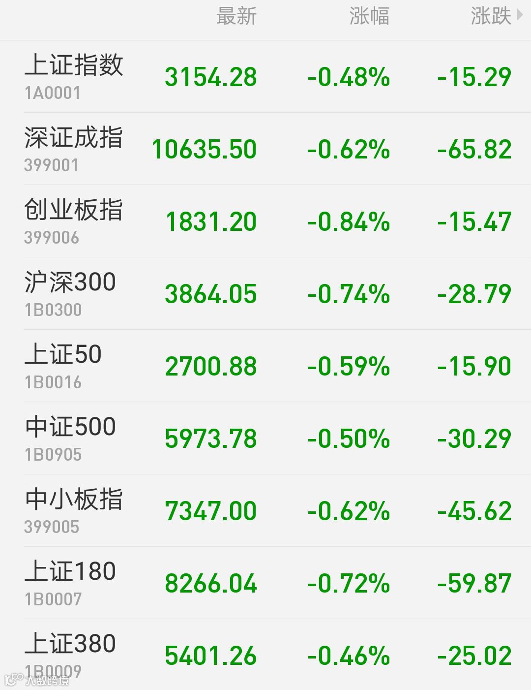 1、A股:上证指数报3154.28点,下跌0.48%,成交额1505.99亿。深证成指报10635.50点,下跌0.62%,成交额2065.57亿。创业板指报1831.20点,下跌0.84%,成交额681.76亿。两市合计成交3571.56亿。从盘面上看,化纤行业、石油行业等板块涨幅居前。