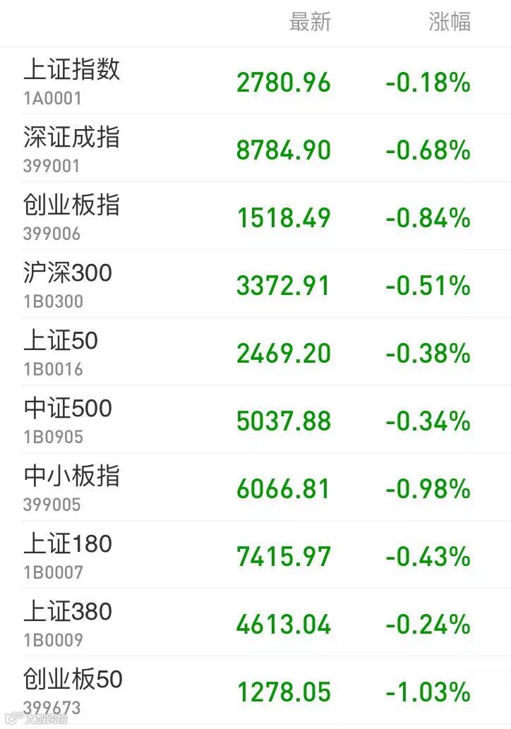 1、A股:上证指数报2780.96点,下跌0.18%,成交额1124.65亿。深证成指报8784.90点,下跌0.68%,成交额1559.69亿。创业板指报1518.49点,下跌0.84%,成交额483.15亿。两市合计成交2684.34亿。从盘面看,天然气、玻璃陶瓷等板块涨幅居前。