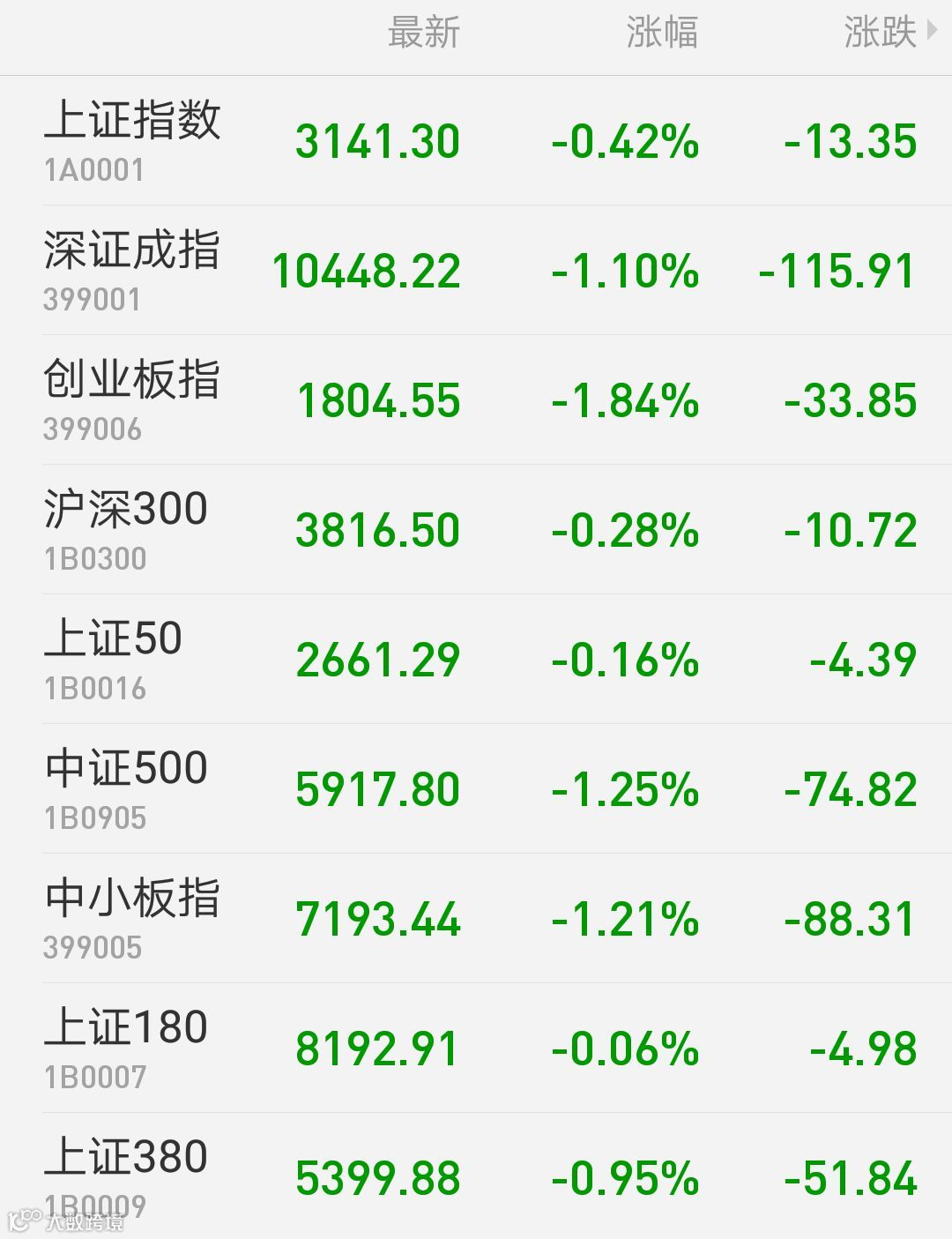 1、A股:上证指数报3141.30点,下跌0.42%,成交额1665.54亿。深证成指报10448.22点,下跌1.10%,成交额2321.26亿。创业板指报1804.55点,下跌1.84%,成交额828.43亿。两市合计成交3986.8亿。从盘面上看,汽车、酿酒等板块涨幅居前。
