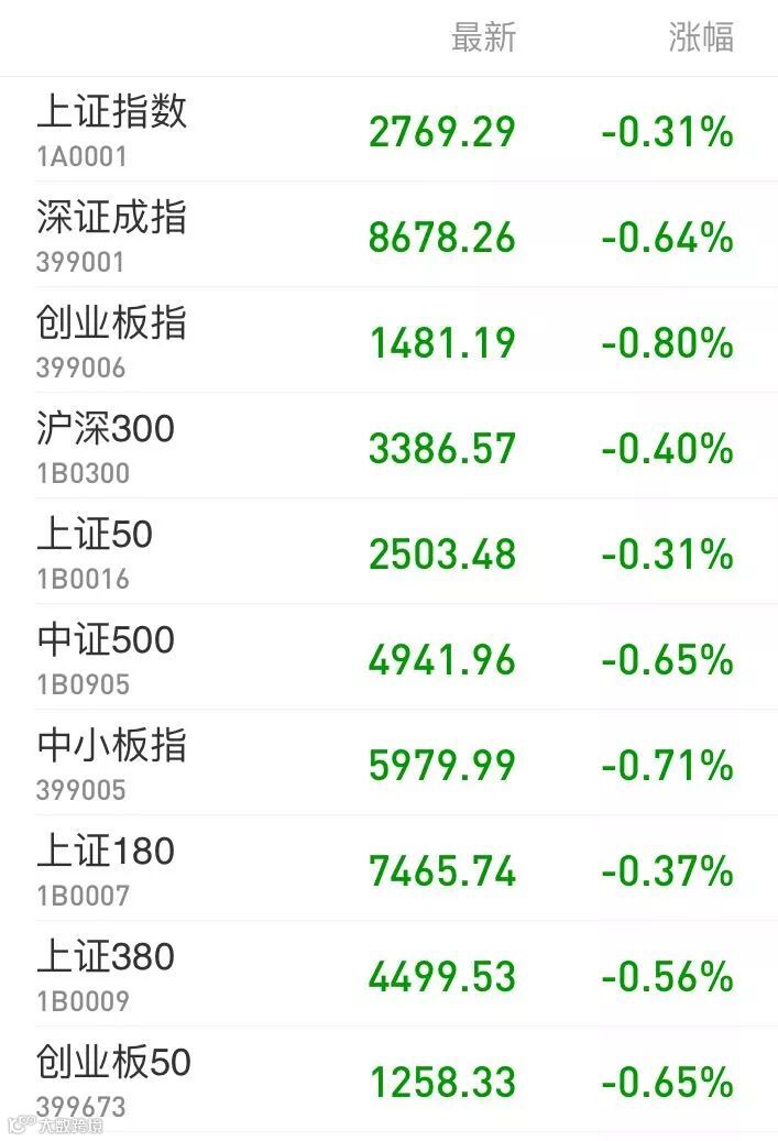 1、A股:上证指数报2769.29点,下跌0.31%,成交额1012.21亿。深证成指报8678.26点,下跌0.64%,成交额1451.48亿。创业板指报1481.19点,下跌0.8%,成交额441.42亿。两市合计成交2463.69亿。从盘面上看,船舶制造、航天航空等板块涨幅居前。