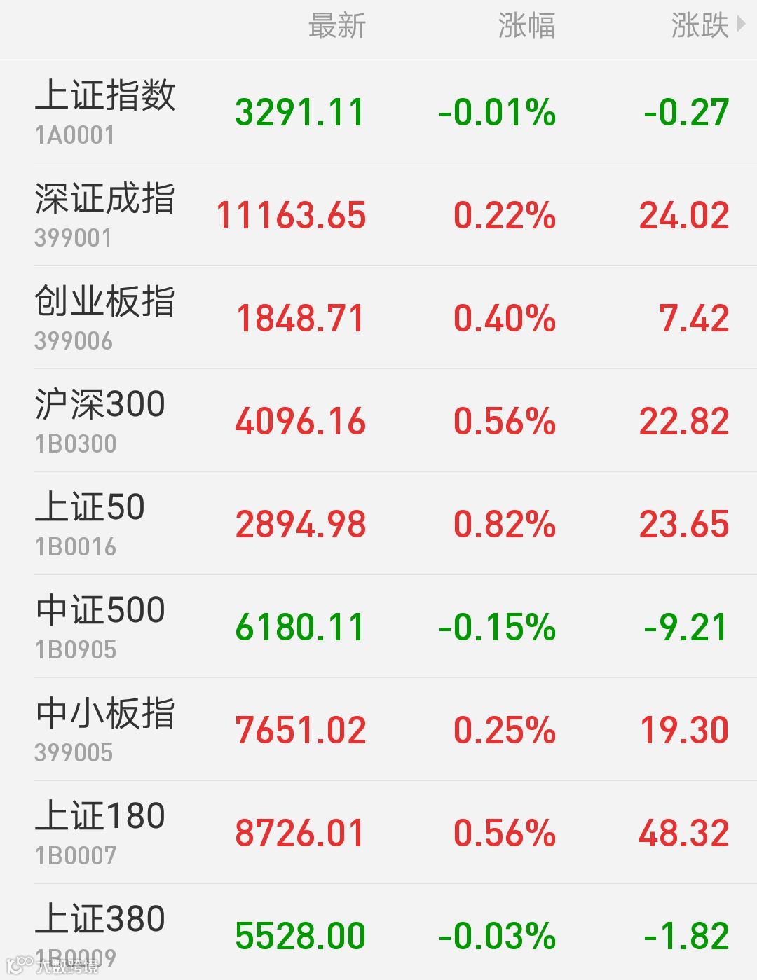 1、A股:上证指数报3291.11点,下跌0.01%,成交额1795.17亿。深证成指报11163.65点,上涨0.22%,成交额2556.99亿。创业板指报1848.71点,上涨0.40%,成交额805.51亿。两市合计成交4352.16亿。从盘面上看,保险等板块涨幅居前。