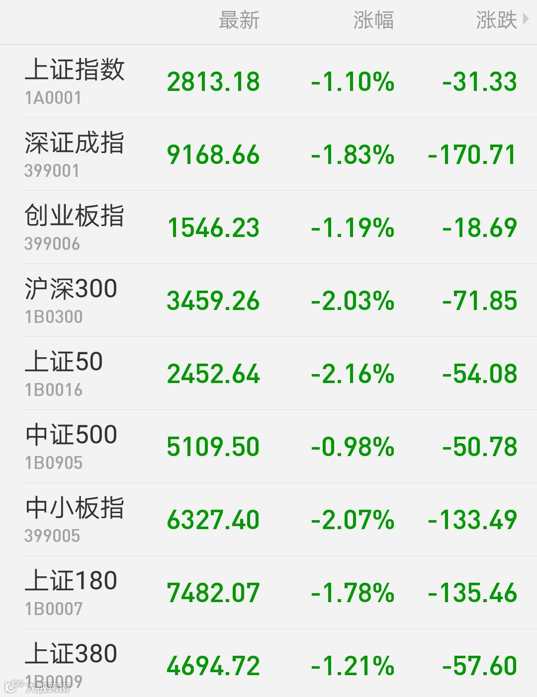 1、A股:上证指数报2813.18点,下跌1.1%,成交额1424.13亿。沪指盘中一度失守2800点整数关口,再创逾两年新低。白酒、地产等蓝筹股集体杀跌带动上证50一度跌超2.5%,创年内新低。深证成指报9168.66点,下跌1.83%,成交额1837.78亿。创业板指报1546.23点,下跌1.19%,成交额630.35亿。两市合计成交3261.92亿。从盘面看,石油、天然气等板块涨幅居前。