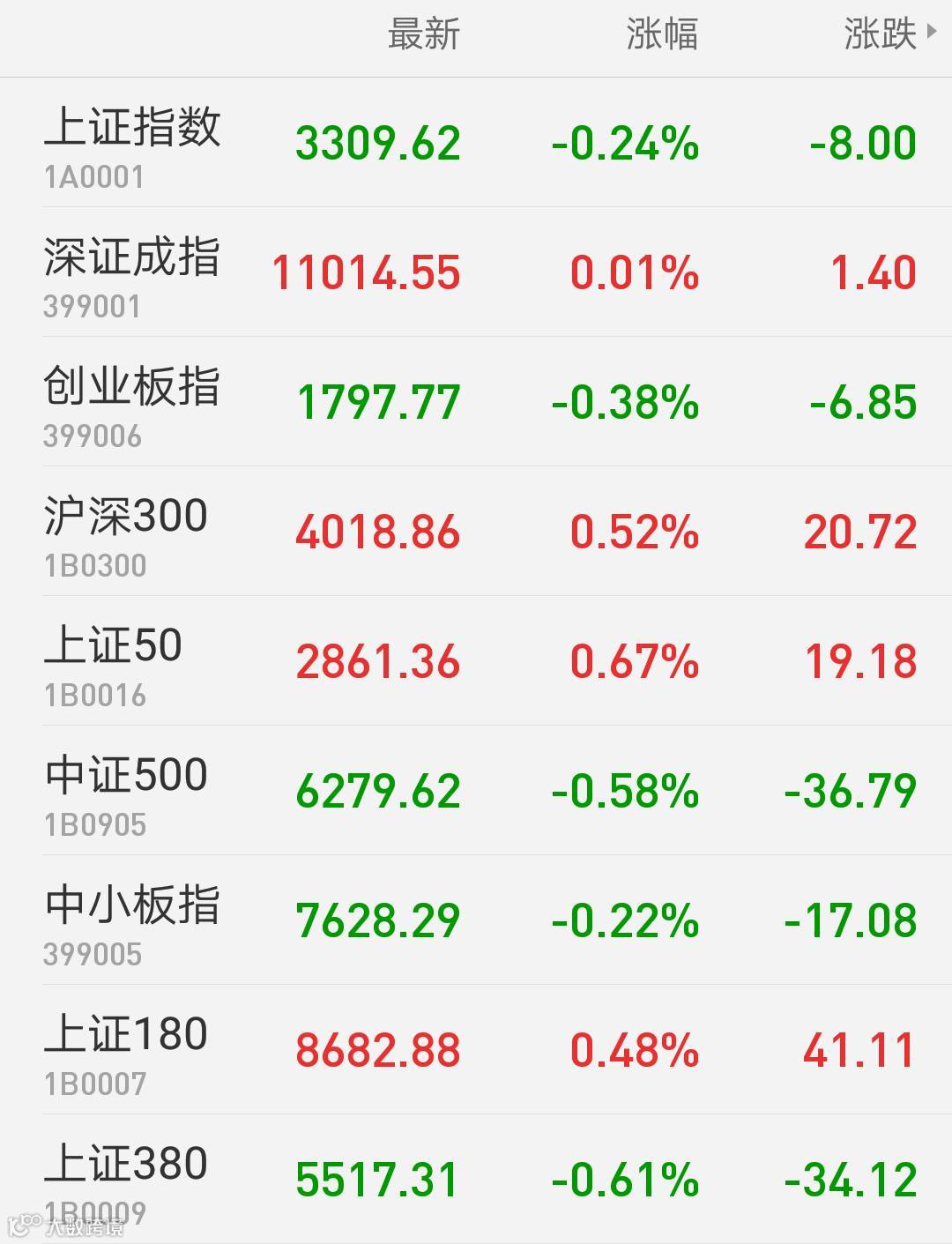1、A股:上证指数报3309.62点,下跌0.24%,成交额1850.25亿。深证成指报11014.55点,上涨0.01%,成交额2222.68亿。创业板指报1797.77点,下跌0.38%,成交额604.1亿。两市合计成交4072.93亿。从盘面上看,保险、酿酒行业等板块涨幅居前。