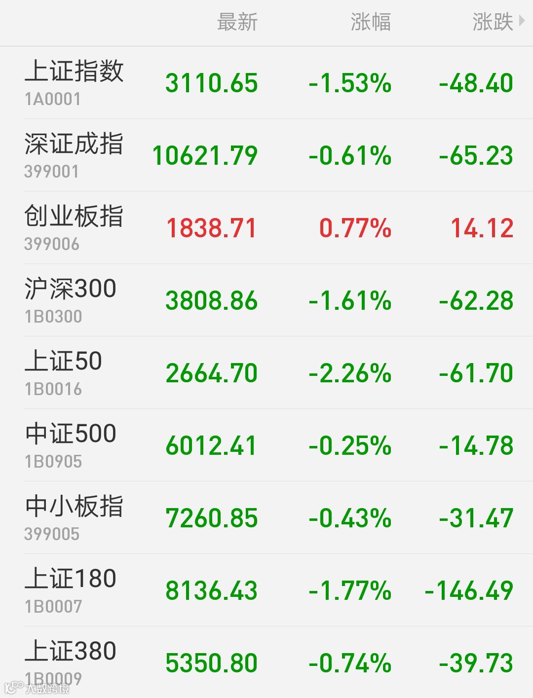 1、A股:上证指数报3110.65点,下跌1.53%,创逾10月新低,成交额1922.33亿。深证成指报10621.79点,下跌0.61%,成交额2584.79亿。创业板指报1838.71点,上涨0.77%,成交额949.80亿。两市合计成交4507.13亿。从盘面上看,软件服务、电信运营等板块涨幅居前。