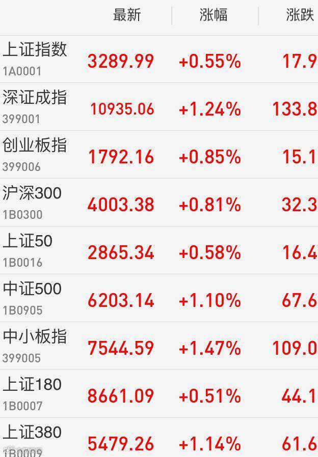 1、A股:上证指数报3289.99点,上涨0.55%,成交额1657.62亿。深证成指报10935.06点,上涨1.24%,成交额2071.08亿。创业板指报1792.16点,上涨0.85%,成交额580.24亿。两市合计成交3728.7亿。从盘面上看,通讯行业、商业百货等板块涨幅居前。