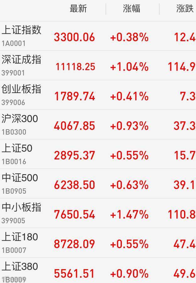 1、A股:上证指数报3300.06点,上涨0.38%,成交额1737.4亿。深证成指报11118.25点,上涨1.04%,成交额2113.39亿。创业板指报1789.74点,上涨0.41%,成交额572.26亿。两市合计成交3850.79亿。从盘面上看,高送转、租售同权等板块涨幅居前。