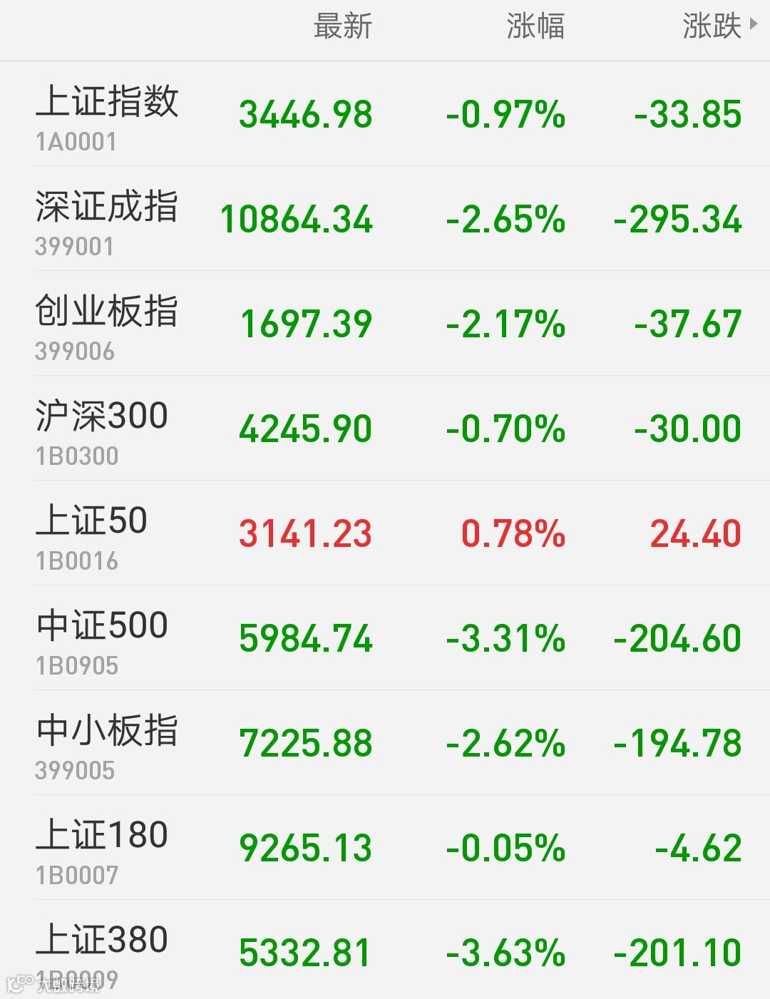1、A股:上证指数报3446.98点,下跌0.97%,成交额2928.82亿。深证成指报10864.34点,下跌2.65%,成交额2742.7亿。创业板指报1697.39点,下跌2.17%,成交额688.58亿。两市合计成交5671.52亿。两市逾200只个股跌停,跌幅超5%的个股更是超过千只。