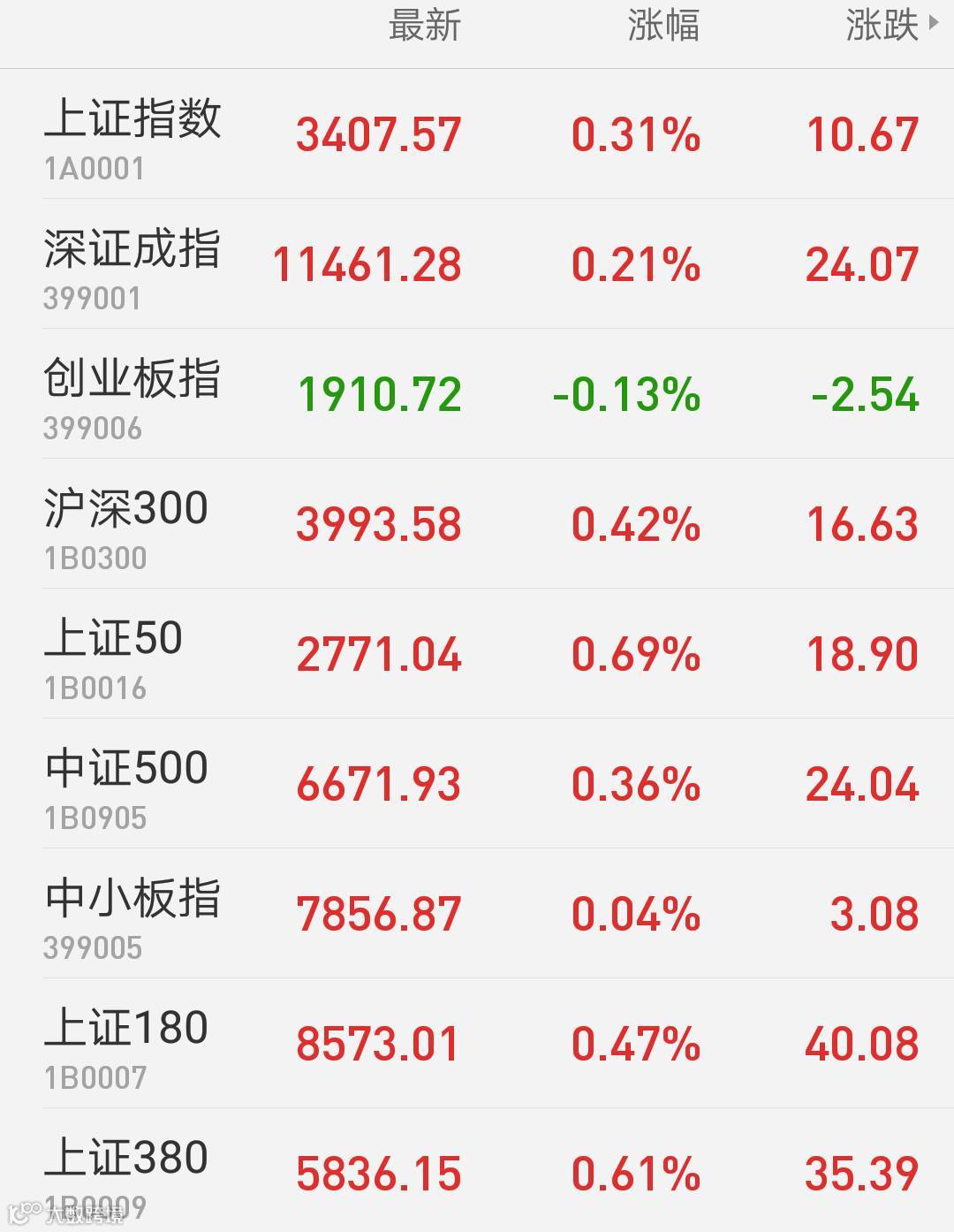 1、A股:上证指数报3407.57点,上涨0.31%,成交额2385.96亿。深证成指报11461.28点,上涨0.21%,成交额2737.48亿。创业板指报1910.72点,下跌0.13%,成交额734.16亿。两市合计成交5123.44亿。从盘面上看,铁路基建、交运设备等板块涨幅居前。