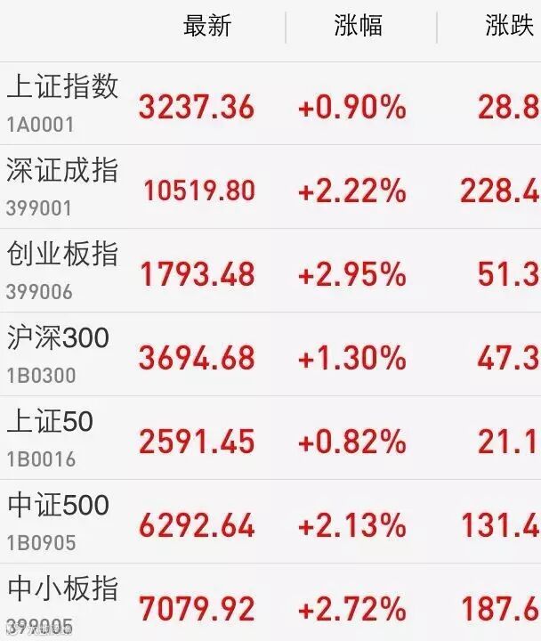 1、A股:A股全天强势,上证综指缩量攀升0.9%报3237.36点;创业板大涨近3%逼近1800点;中小板涨2.7%创逾一年最大升幅;深成指亦升逾2%,报10519.8点。两市成交4721亿元,上日为5361亿。