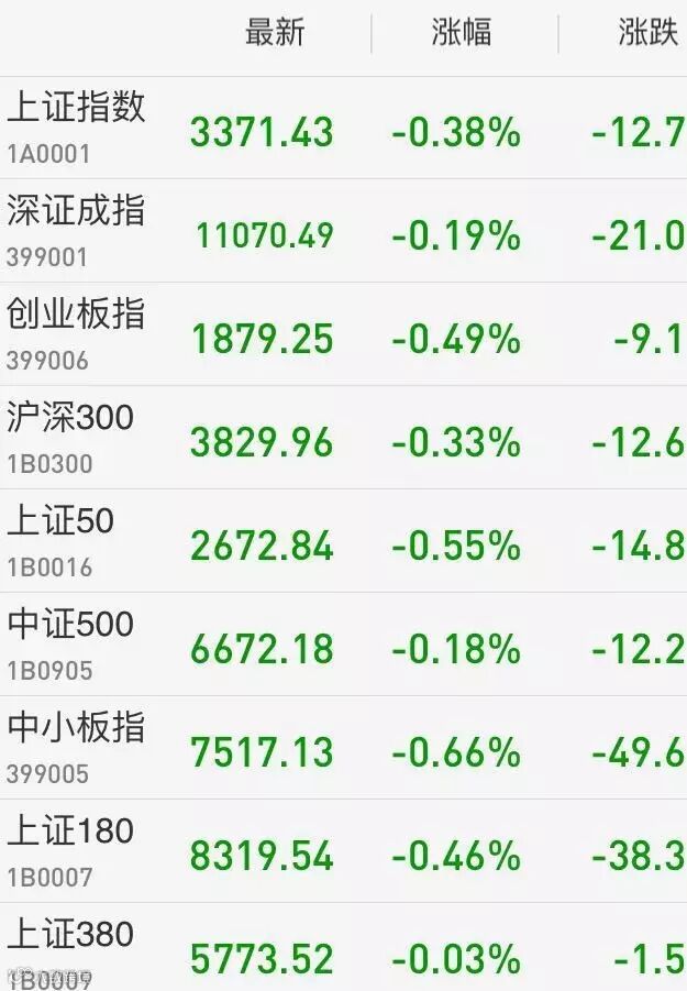 1、A股:上证综指在刷新反弹新高后下探,收跌0.38%报3371.43点,失守5日、10日均线;深成指跌0.19%报11070.49点;创业板指跌0.49%报1879.25点。两市成交5864亿元,上日为5397亿元。