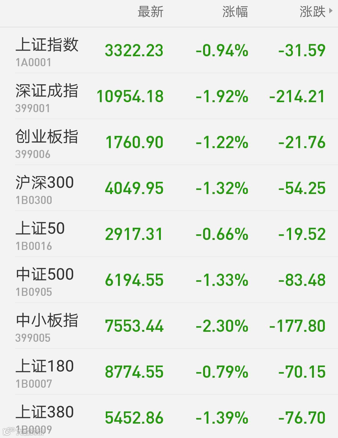1、A股:上证指数报3322.23点,下跌0.94%,成交额2058.03亿。深证成指报10954.18点,下跌1.92%,成交额2256.33亿。创业板指报1760.9点,下跌1.22%,成交额546.73亿。两市合计成交4314.36亿。从盘面上看,高送转、雄安新区等板块涨幅居前。