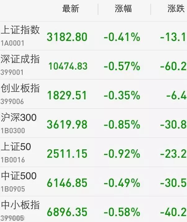 1、A股:上证指数报3182.8点,下跌0.41%,成交额1614.55亿。深证成指报10474.83点,下跌0.57%,成交额2226.02亿。创业板指报1829.51点,下跌0.35%,成交额513.93亿。两市合计成交3840.57亿。从盘面上看,航天航空、石墨烯等板块涨幅居前。