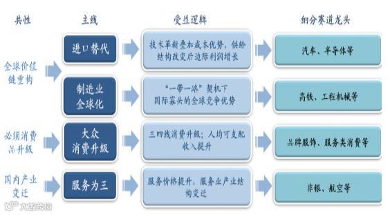 4、“价值迁移”背景下的长期结构配置:寻找“长跑”冠军,布局细分赛道龙头。随着一轮主动补库存周期进入尾声,17年下半年起进入盈利下行周期,未来一段时间内盈利缺乏向上弹性,同时受制于利率和监管因素导致估值结构性受压,市场的格局体现为“结构重于大势,同时个股特征明显”,策略研究中大势研判的重要性是在下降的,而随着价值风格回归、监管套利减少,未来市场的热点会更加聚焦于寻找“穿越周期”的“长跑冠军”。 我们通过借鉴海外经验,海外一个行业要想成为长期战胜市场的“长跑冠军”,一般具有以下三种特征之一:1)在全球分工中扮演关键角色,且是本国的支柱产业;2)稳定增长的必须消费品;3)顺应了本国产业结构的大变迁进程。国内比较典型的“长跑”冠军是全球分工的“关键先生”白色家电和必须消费品“长牛”高端白酒和医药龙头,未来各细分赛道最可能出现“长跑”冠军的几个方向主要有进口替代(汽车、半导体)、制造业全球化(高铁、工程机械的全球寡头)、大众消费升级(品牌服饰、服务类消费等)和服务业(非银、航空等)。